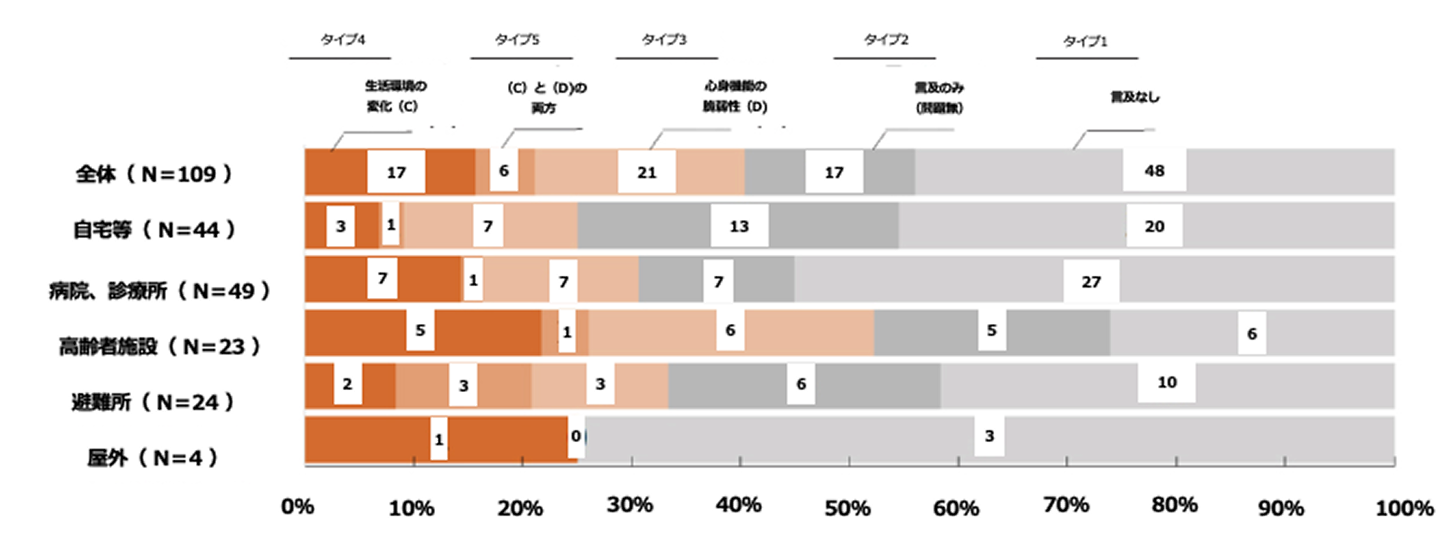 申立書における食の問題に関する記述の割合(生活拠点別)。東日本大震災時の気仙沼市の事例。オレンジ色の部分は記述がある事例を示し、灰色の部分は記述がない事例を示しています。また、記述の文脈に応じて「生活環境の変化」「心身機能の脆弱性」「その両方」に細かく分類しています。高齢者施設を生活拠点とされていた方に食の問題に関する記述が多く見られました。
