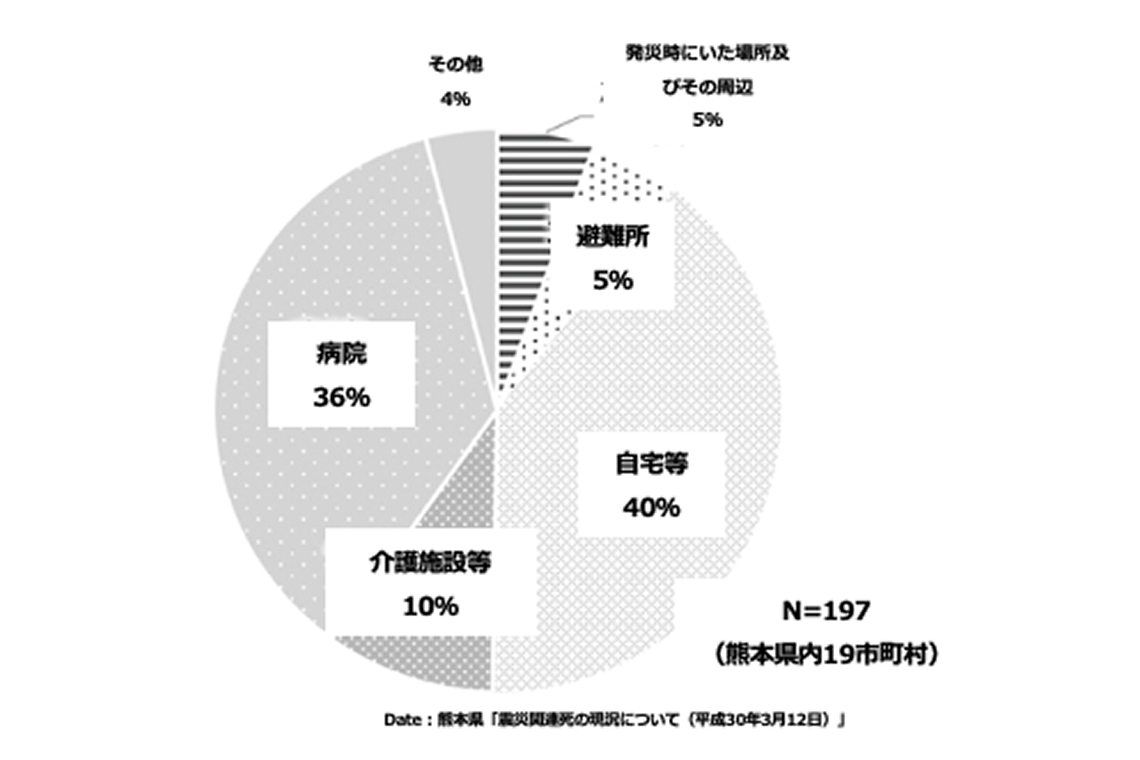関連死の発生場所。熊本地震の事例。病院、介護施設で46%を占めています。(出典:奥村、2024)
