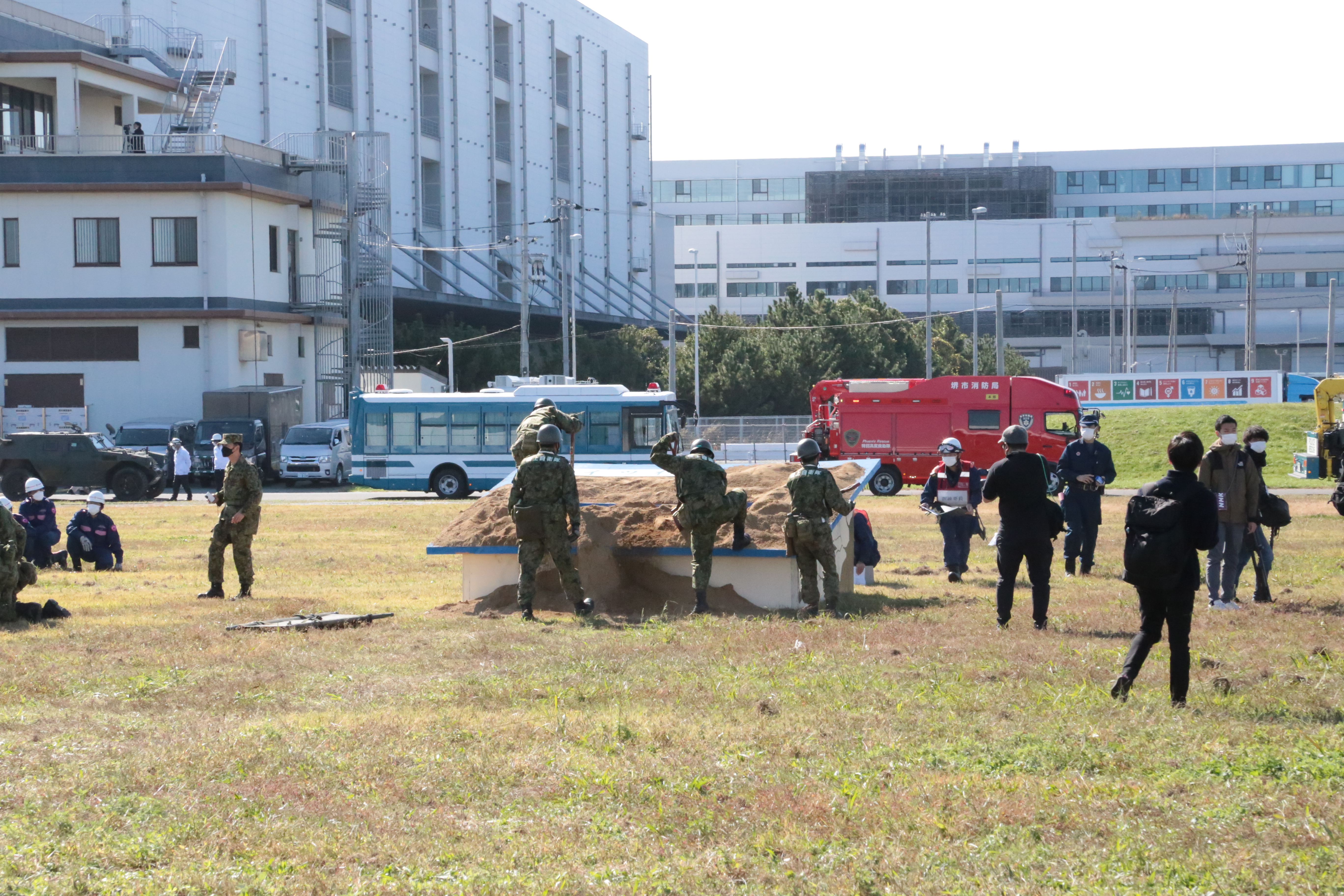 それ以外には、大阪府警のヘリコプター「おおわし」による津波避難訓練として災害現場の被害者救助活動や、海上保安庁・堺市消防などによる陸・海からによる大規模な消火放水訓練、陸上自衛隊による災害現場の避難・捜索訓練などが様々な災害想定の元で大々的に催されました。