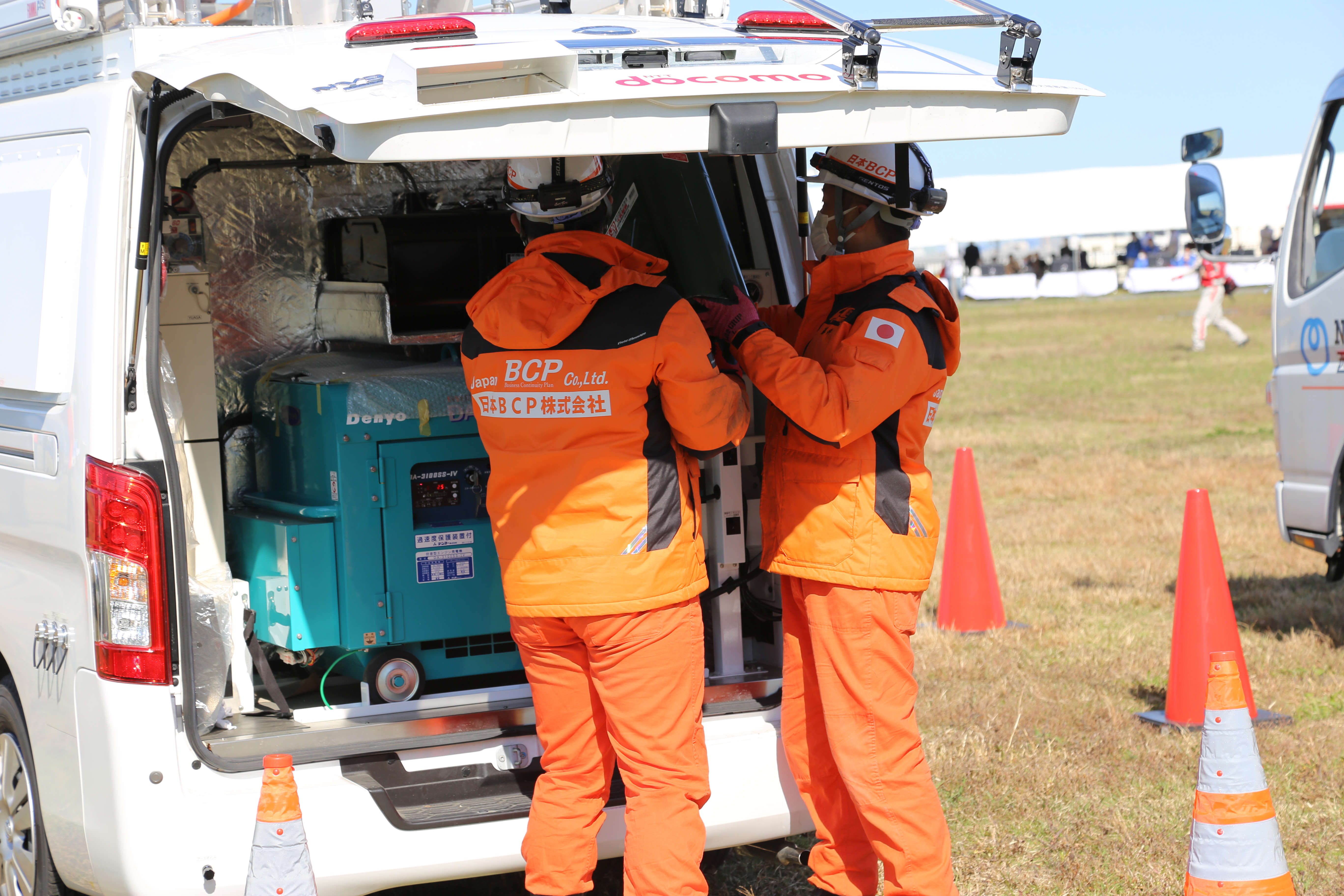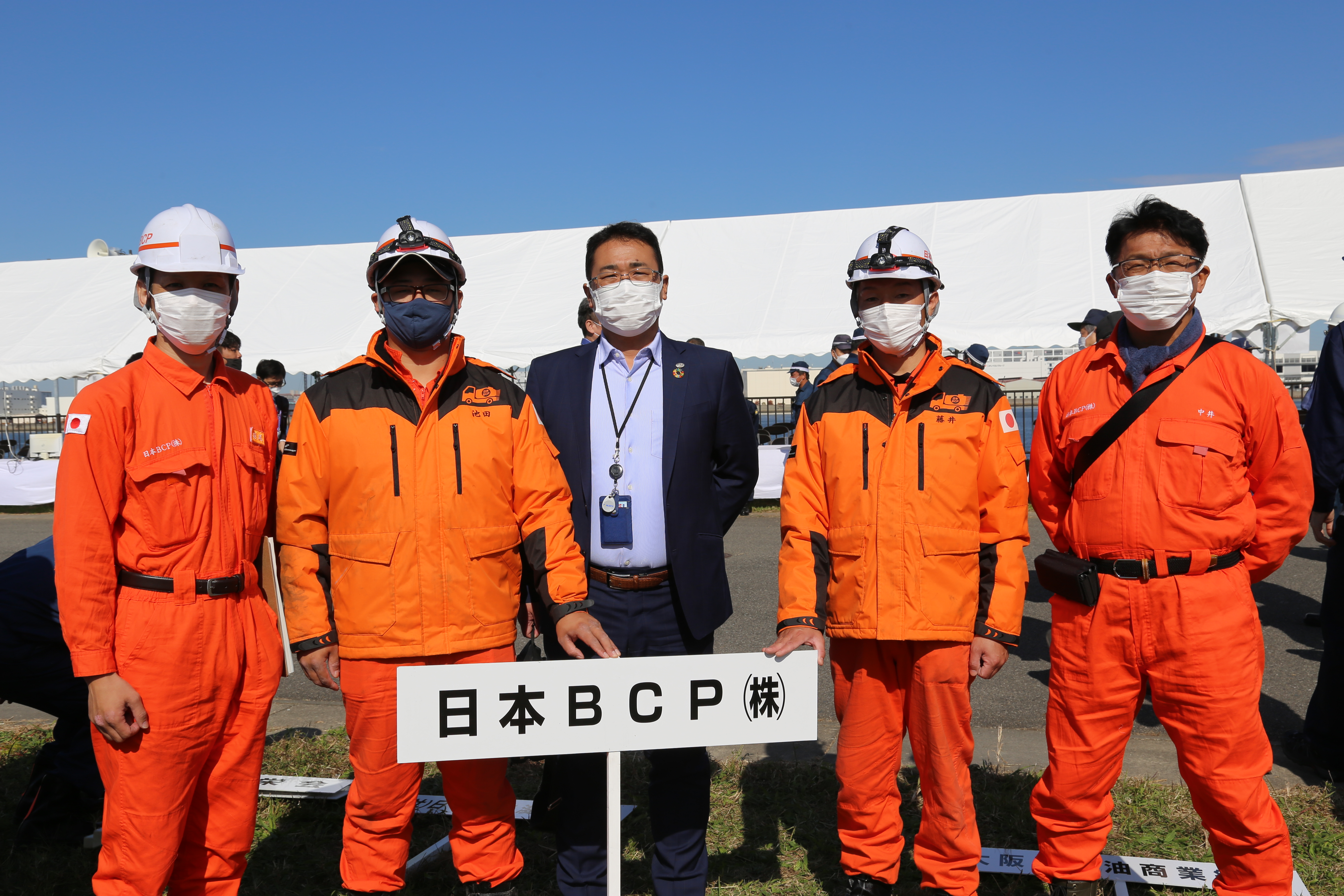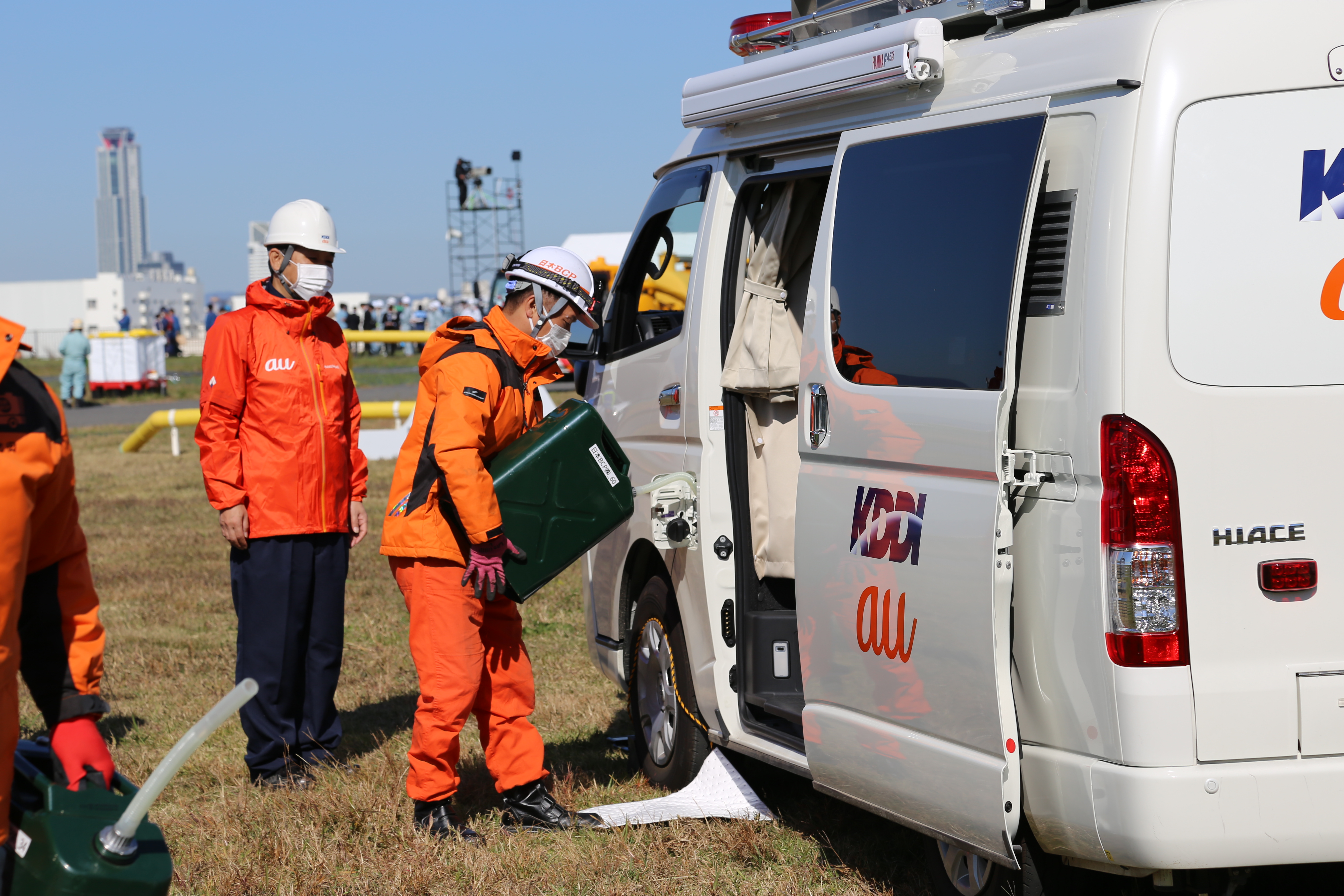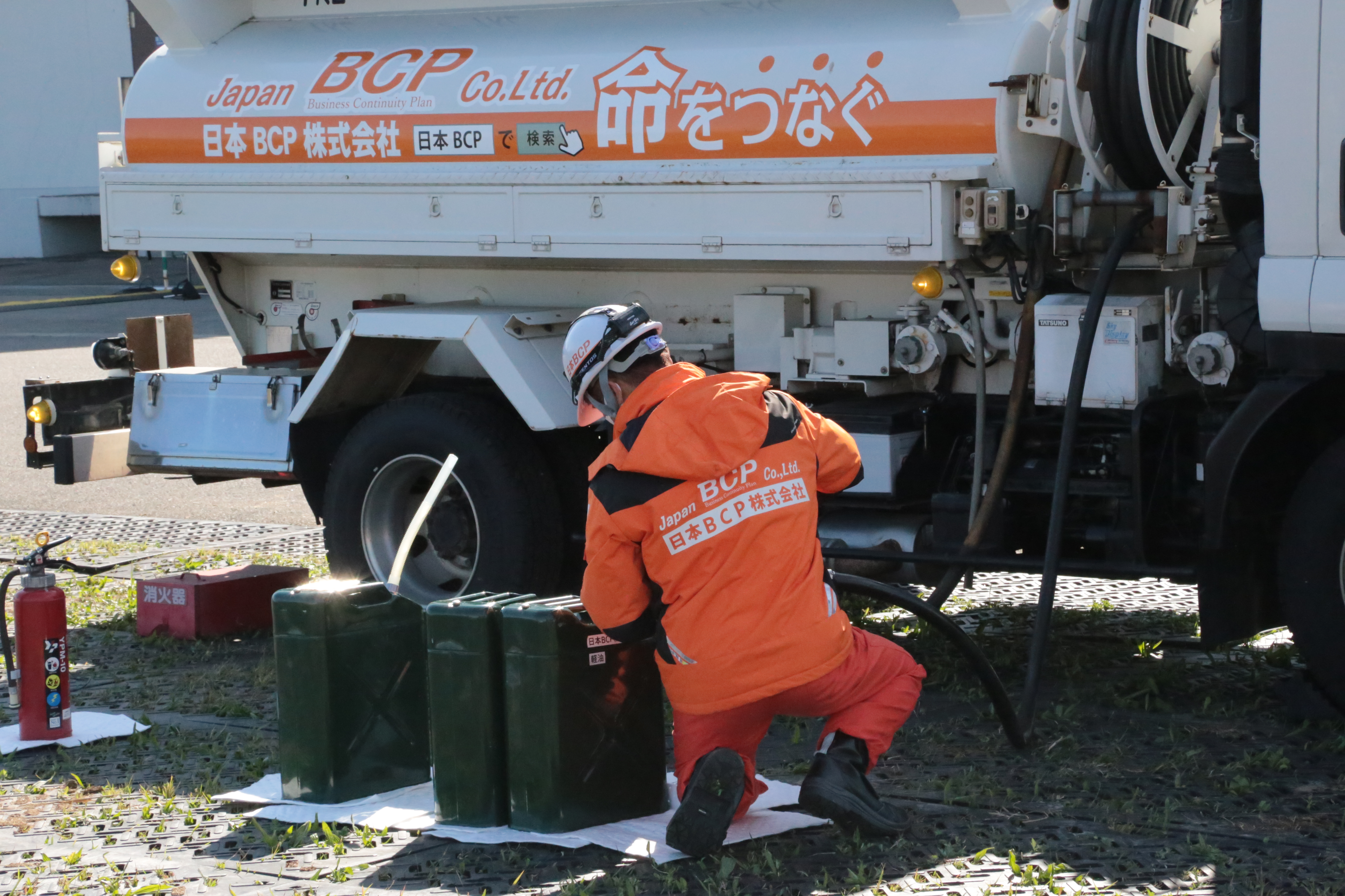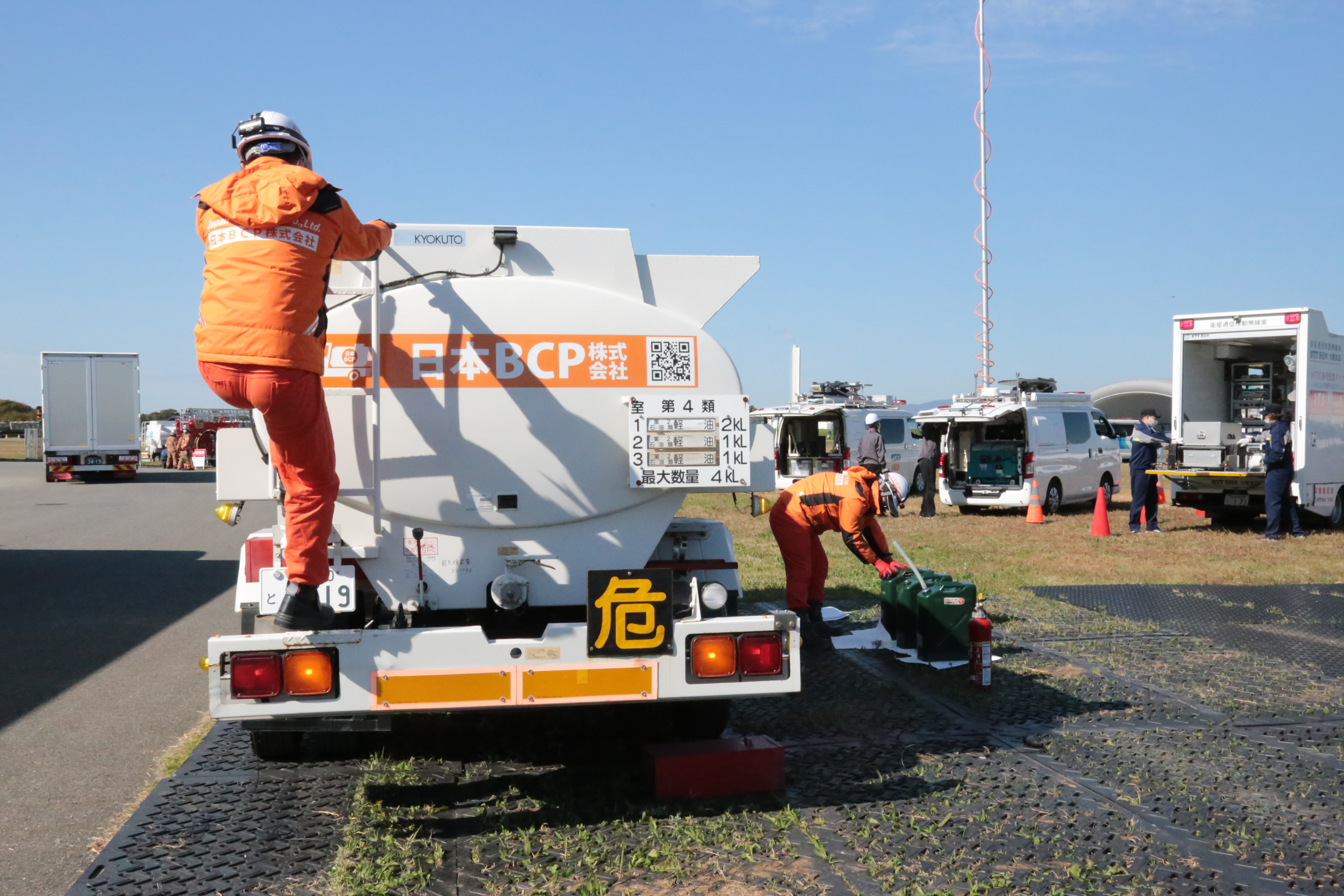 きっかけは、去年の10月に堺市と締結した「災害時の燃料配送」に関する防災協定により参加依頼をいただき、今回は訓練内の「ライフラインの復旧訓練」において、通信キャリア各社が移動基地局を出動し災害現場における通信電波の確保に努める中、長時間に渡る基地局稼働の備えとして、日本BCPは燃料補給のためのタンクローリーを出動。各社車両の燃料及び移動基地局に搭載された発電機の燃料補給をおこないました。