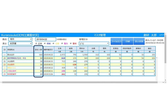 備蓄品は専用システムで拠点ごとの在庫状況や賞味期限等を一元管理します。期限切れアラートメールも標準装備していますので入れ替え忘れも防ぎます。