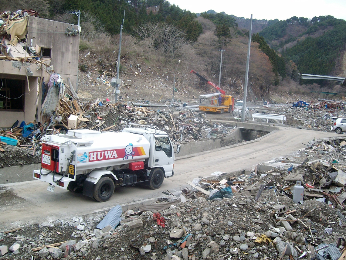 2011年3月11日「東日本大震災」発生後、シューワ株式会社は、内閣府からの要請を受けて約3か月間、岩手県で復興支援活動を行いました。この経験を踏まえ、2012年6月にシューワ株式会社にて災害時を想定した石油燃料の保管と配送を専門で行う「BCP事業部」が発足しました。 -