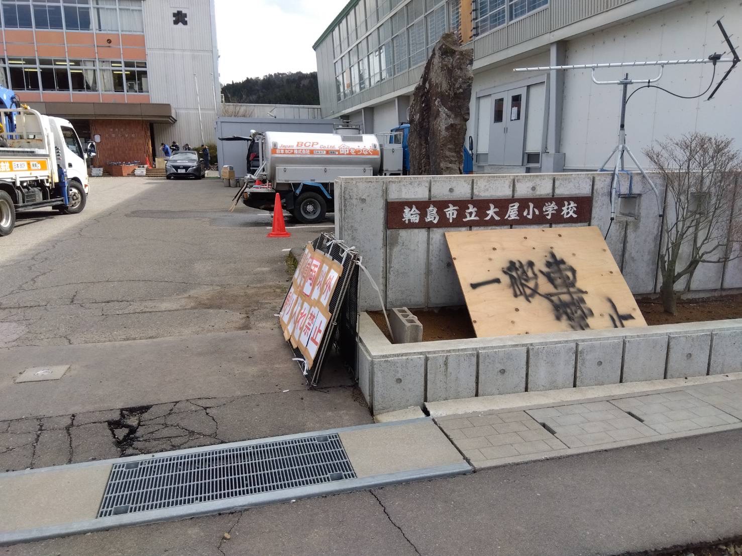 輪島市役所様のご依頼で貸し出しをさせていただいております当社の給水車が輪島市立大屋小学校に設置され、現地での給水活動にお役立ていただいております。