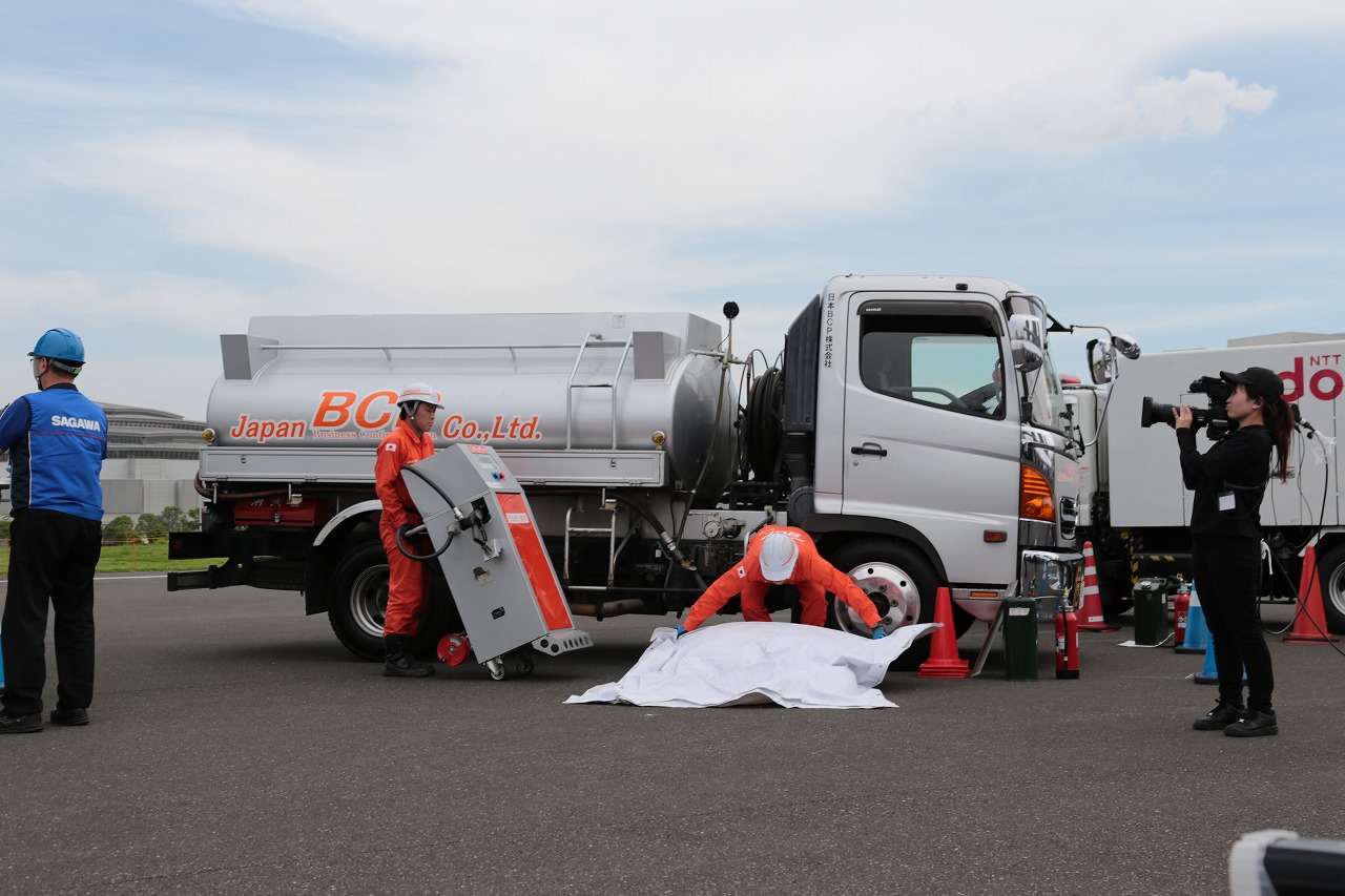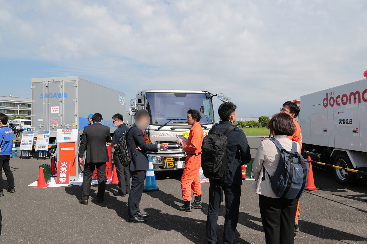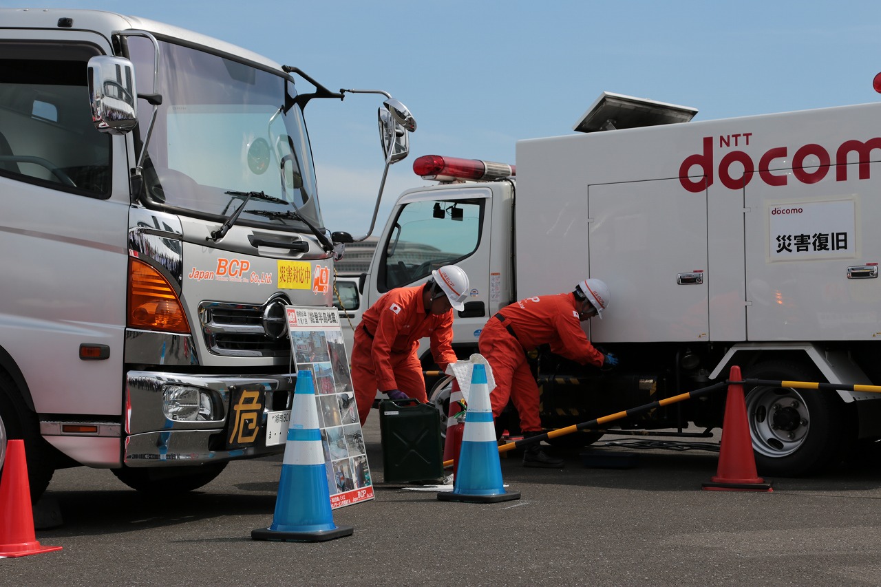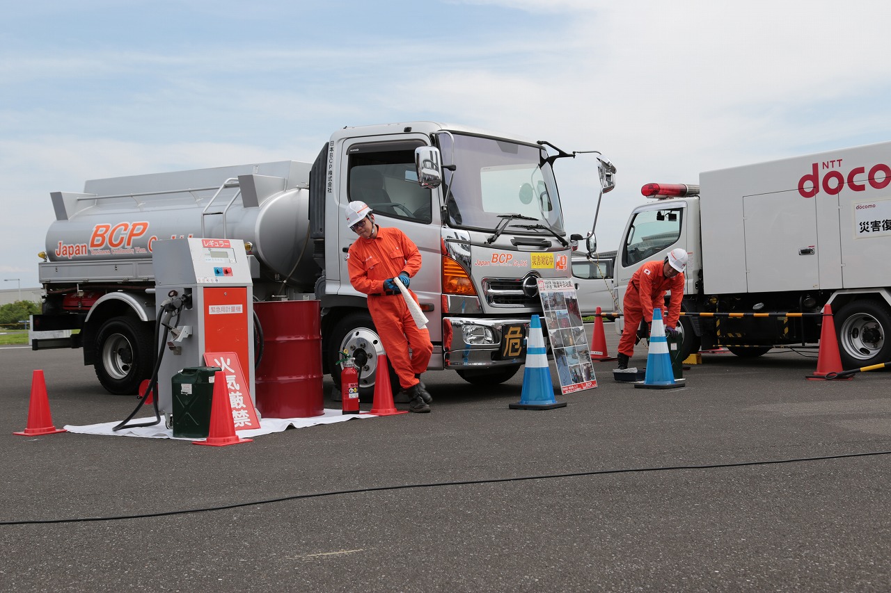 地震等の災害時におけるNTTドコモグループ様の対策について来賓の皆様にご説明をする一環として、移動電源車や移動アンテナへの給油作業のデモンストレーションをさせていただきました。