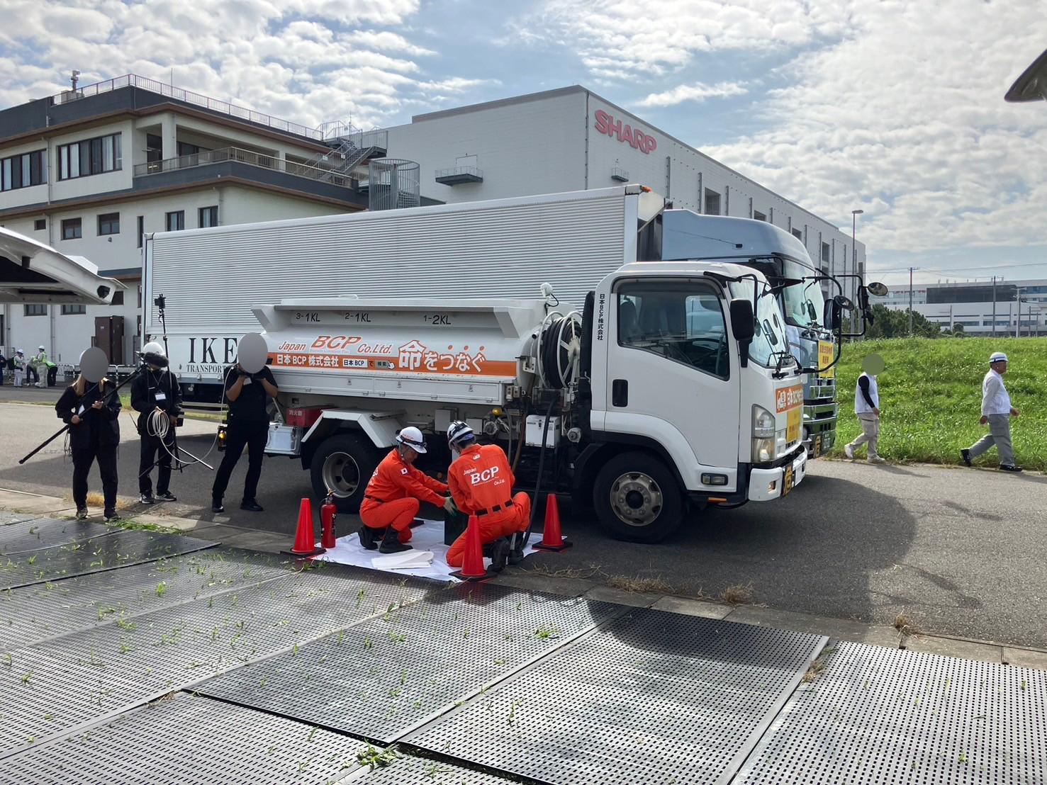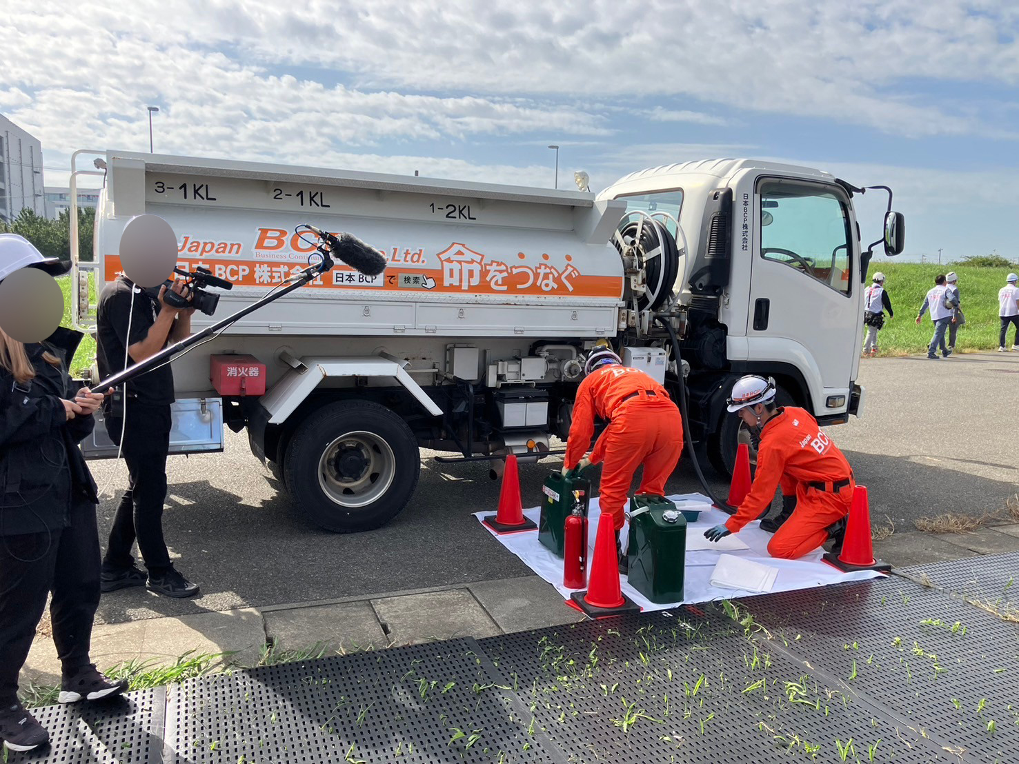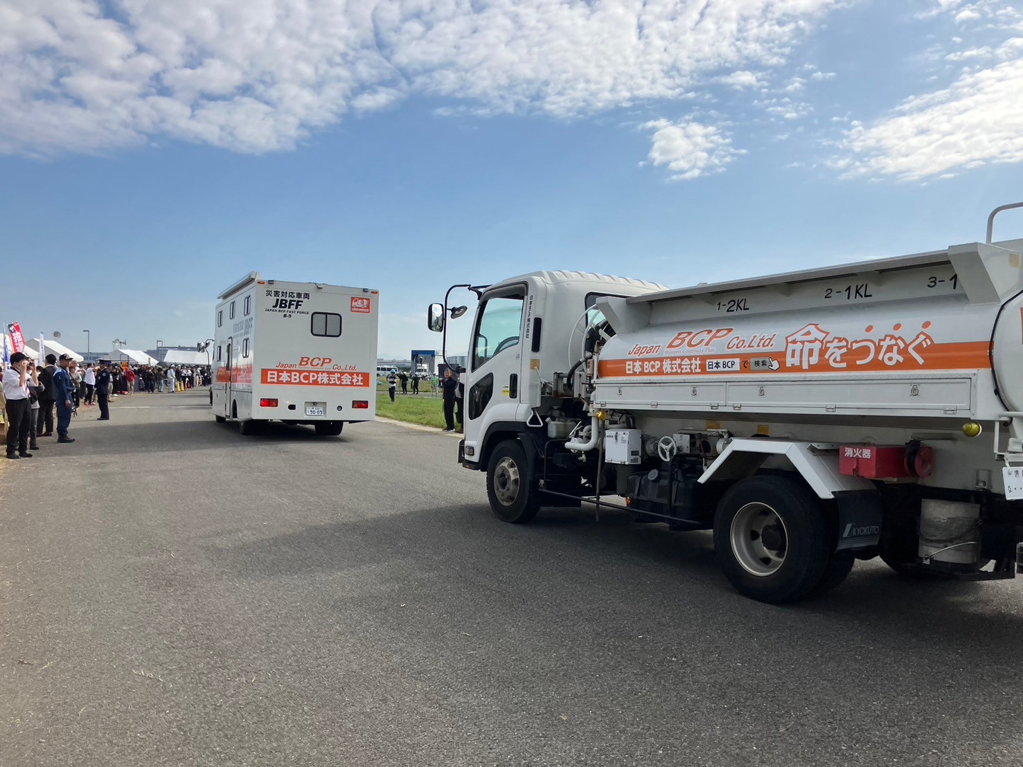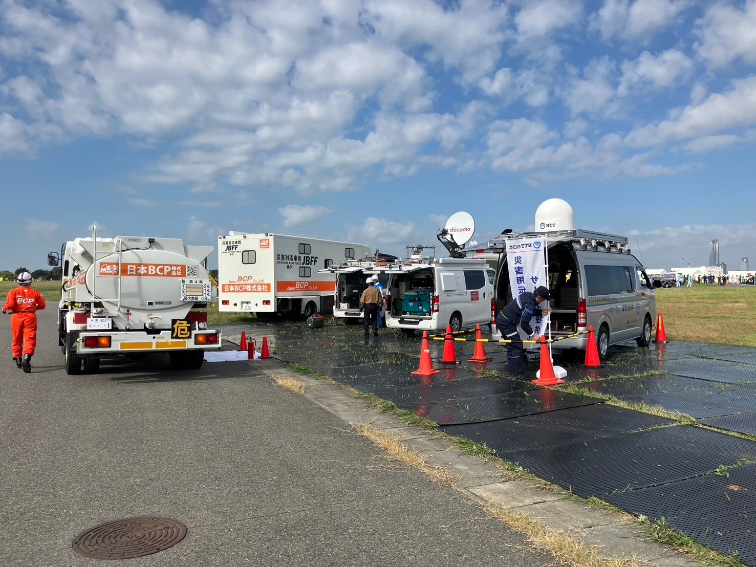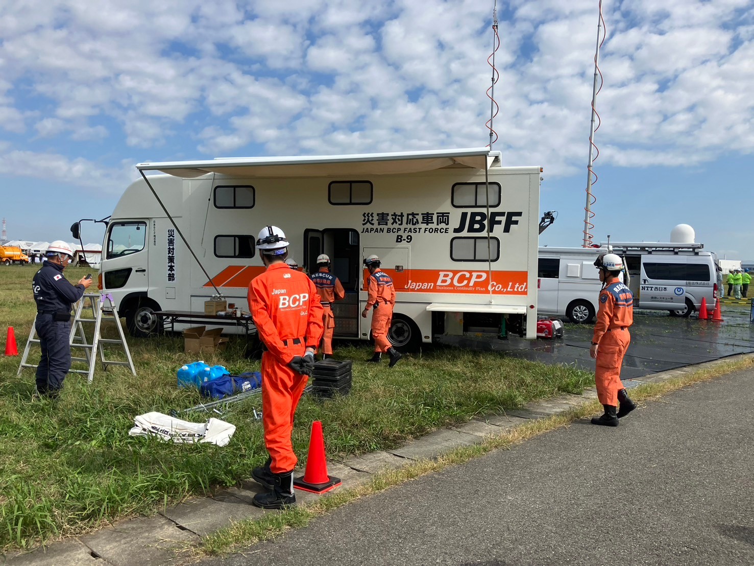 弊社は、能登半島地震で実際に対応させていただいた携帯キャリア様との連携で給油訓練を実施し、かつ、被災地での活動をよりリアルに再現するために、名称:B-9 指揮車両兼キャンピングカーの特殊車両を持ち込みました。