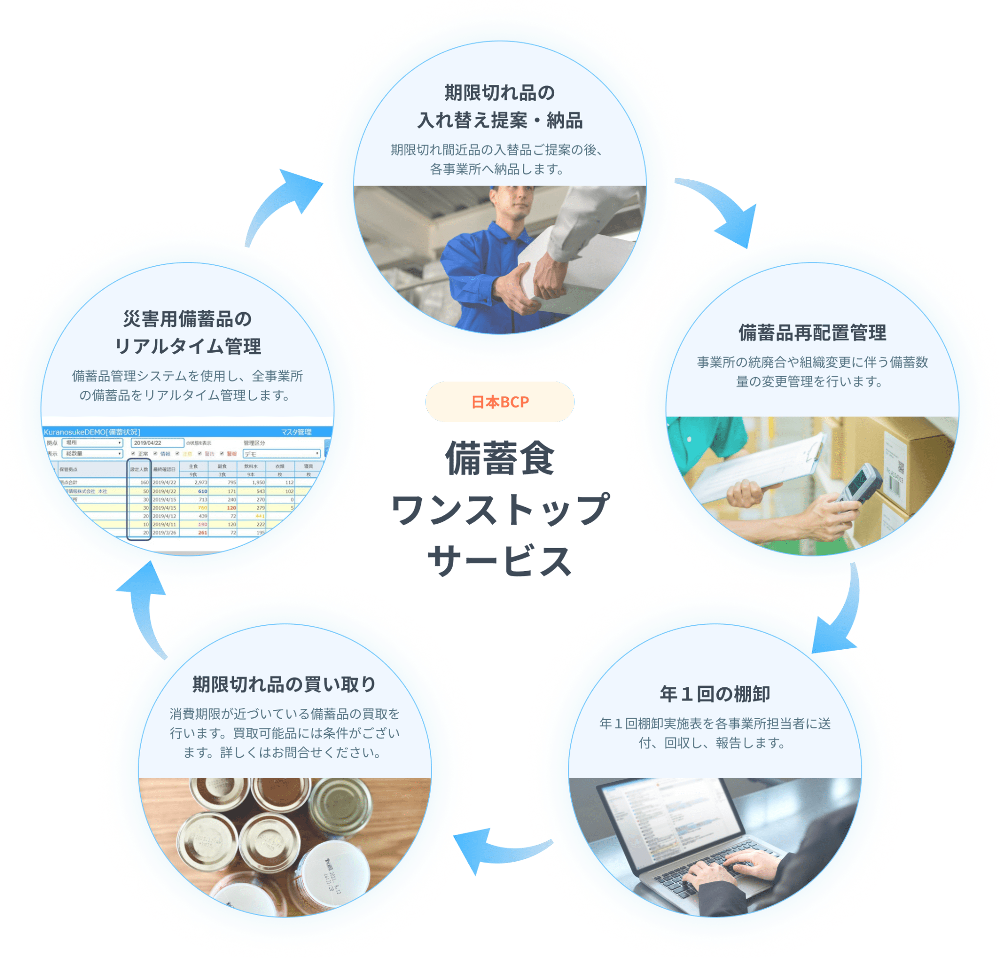 備蓄食・防災品の在庫管理から入替までワンストップでご提案します。