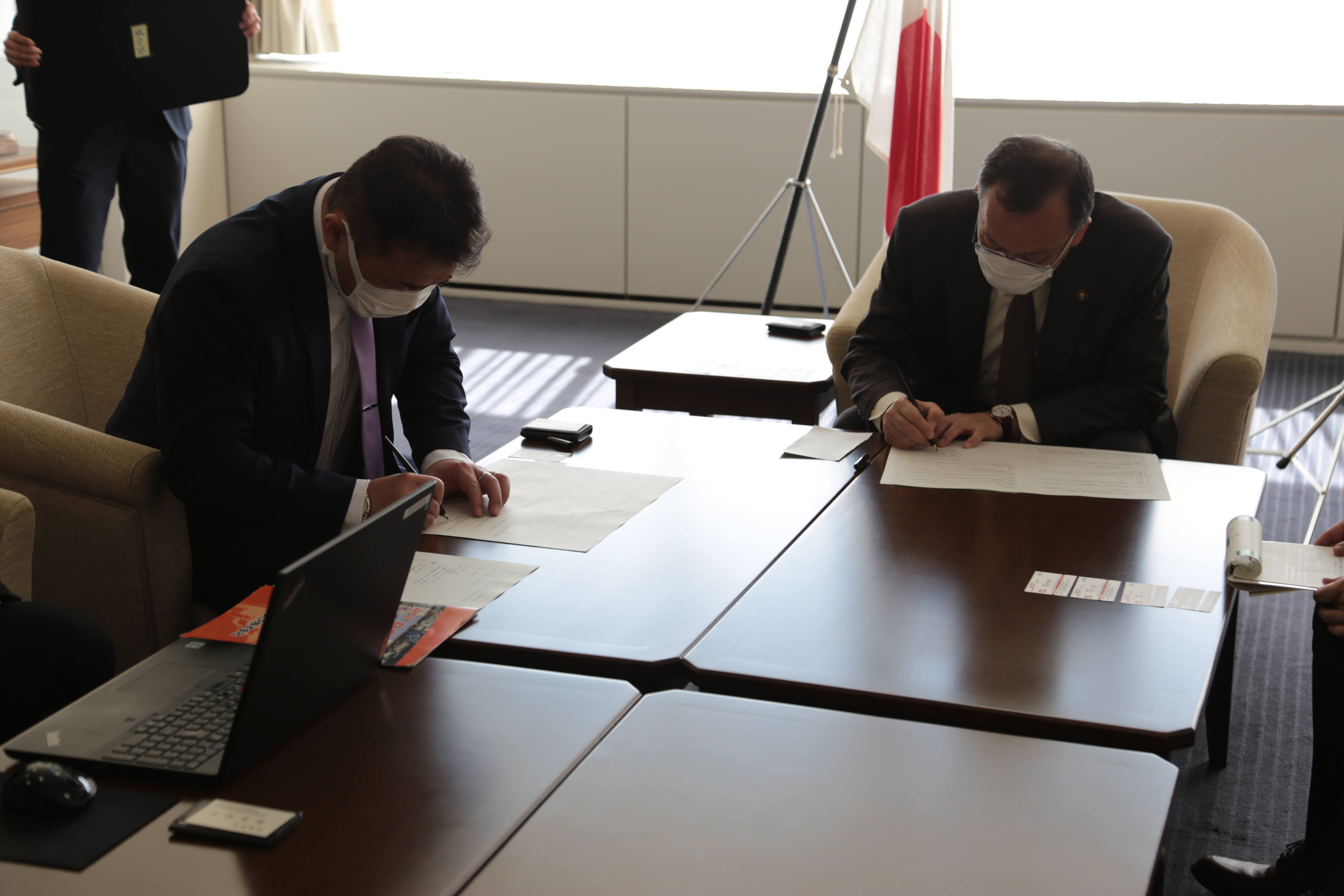 11時からの締結式には、落合市長、小泉防災・危機管理監にご列席いただき、落合市長と弊社社長の角谷が協定書へ署名した後、協定書を交換し、滞りなく式は終了いたしました。