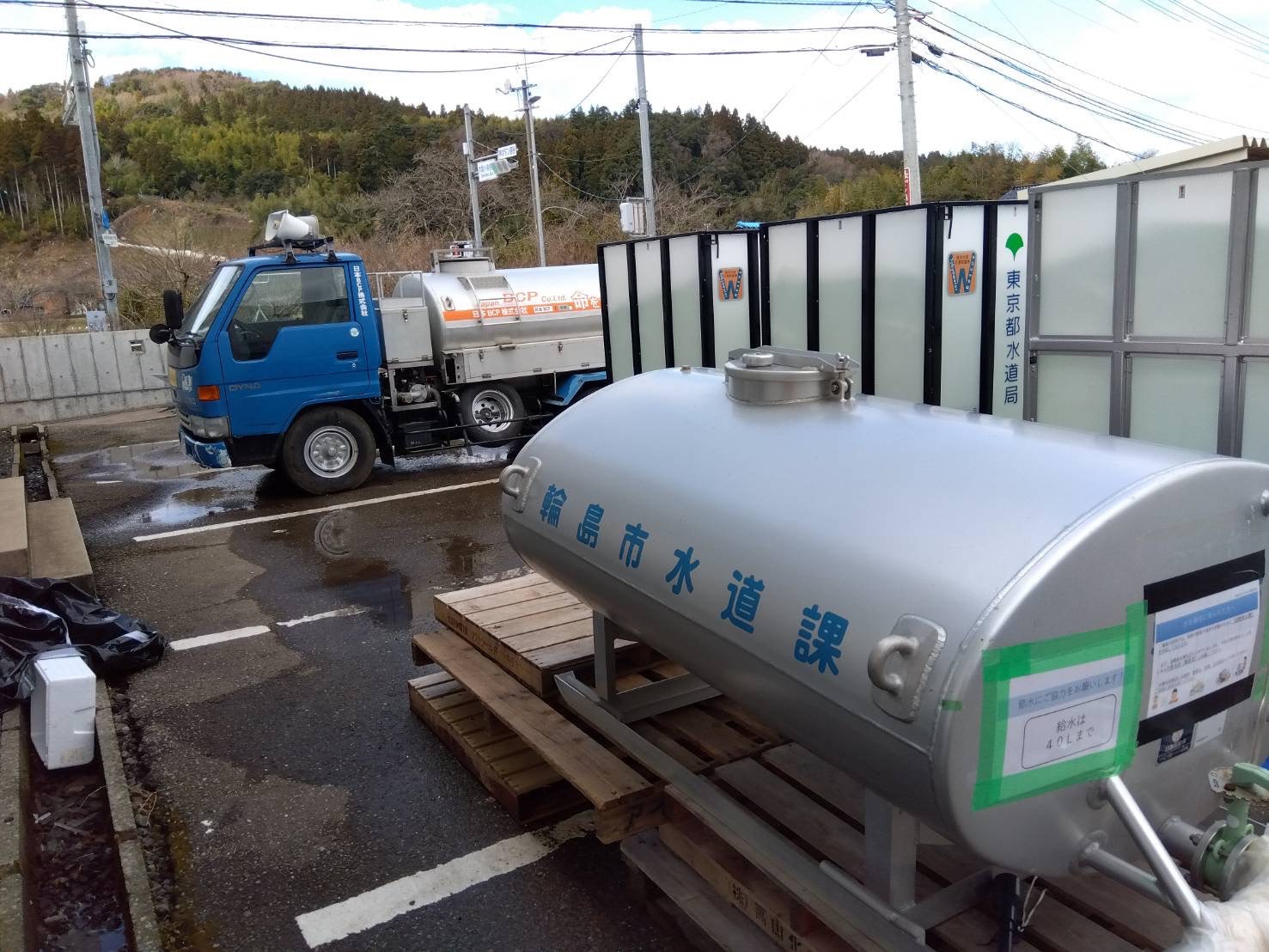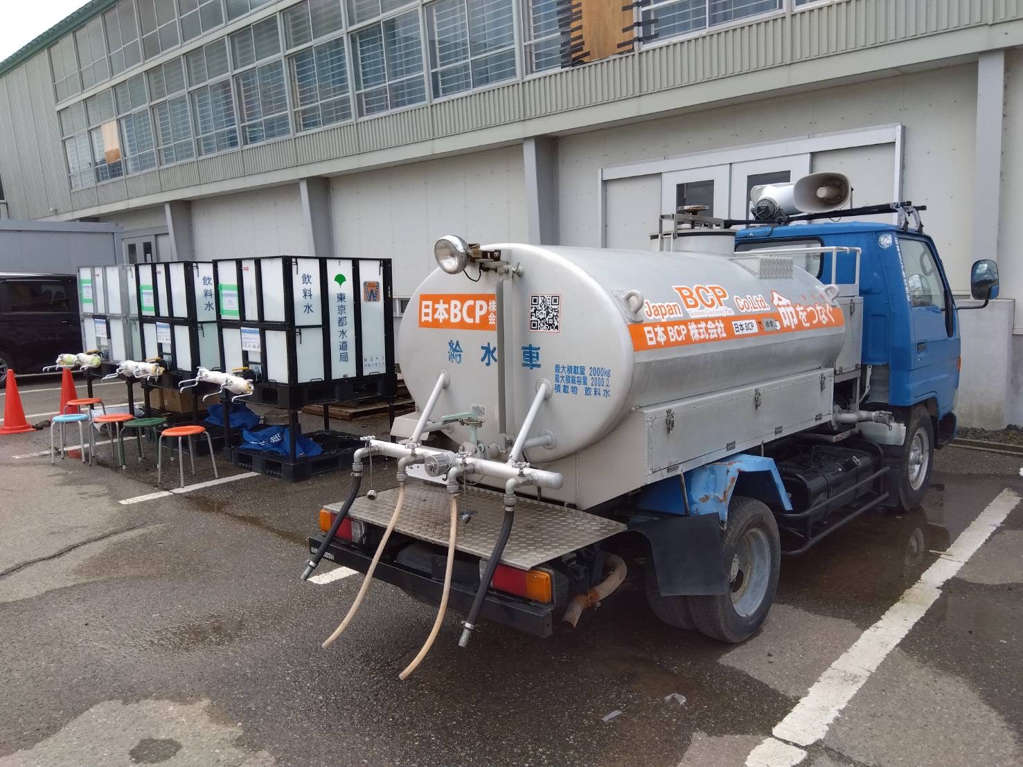 輪島市役所様のご依頼で貸し出しをさせていただいております当社の給水車が輪島市立大屋小学校に設置され、現地での給水活動にお役立ていただいております。