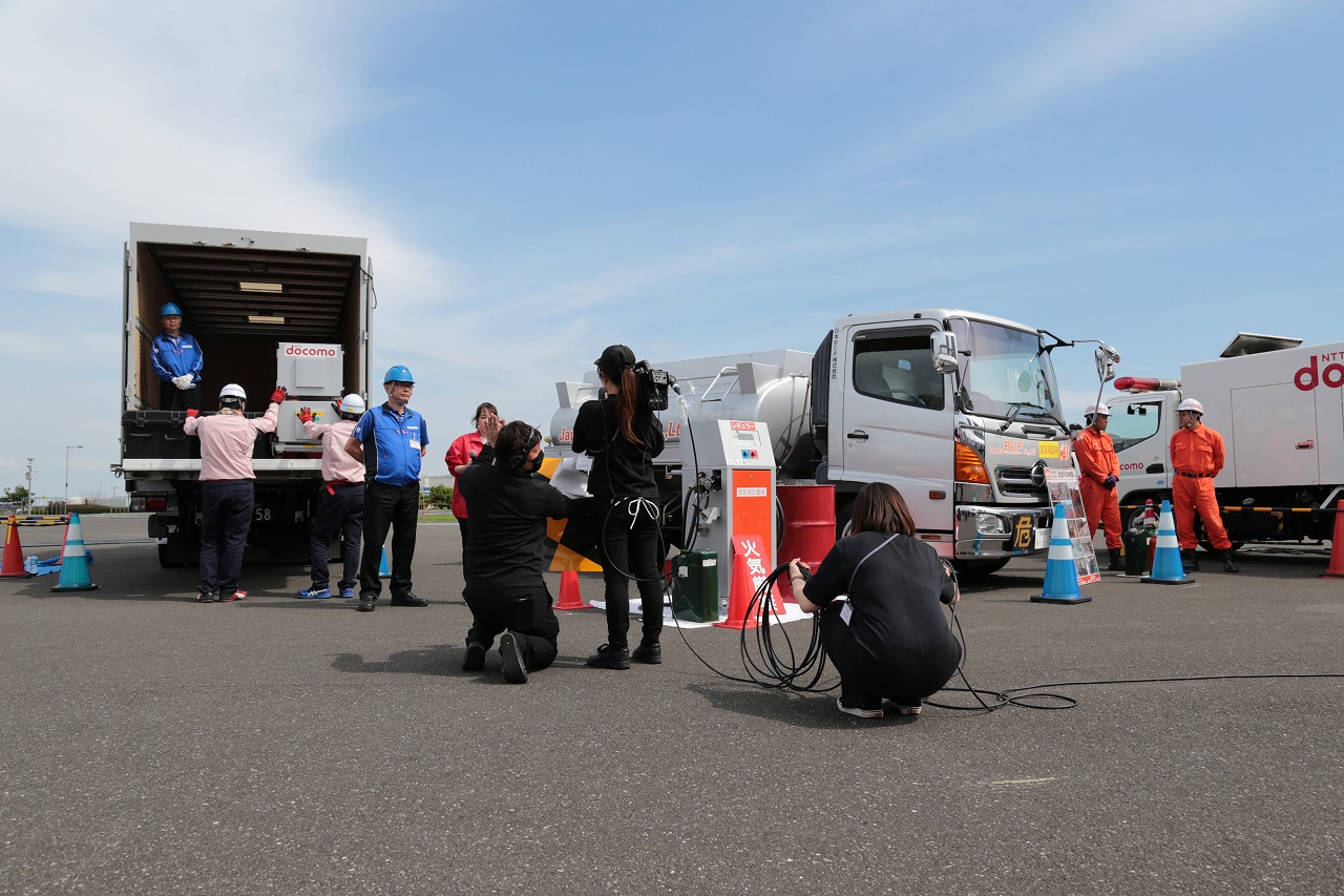 地震等の災害時におけるNTTドコモグループ様の対策について来賓の皆様にご説明をする一環として、移動電源車や移動アンテナへの給油作業のデモンストレーションをさせていただきました。
