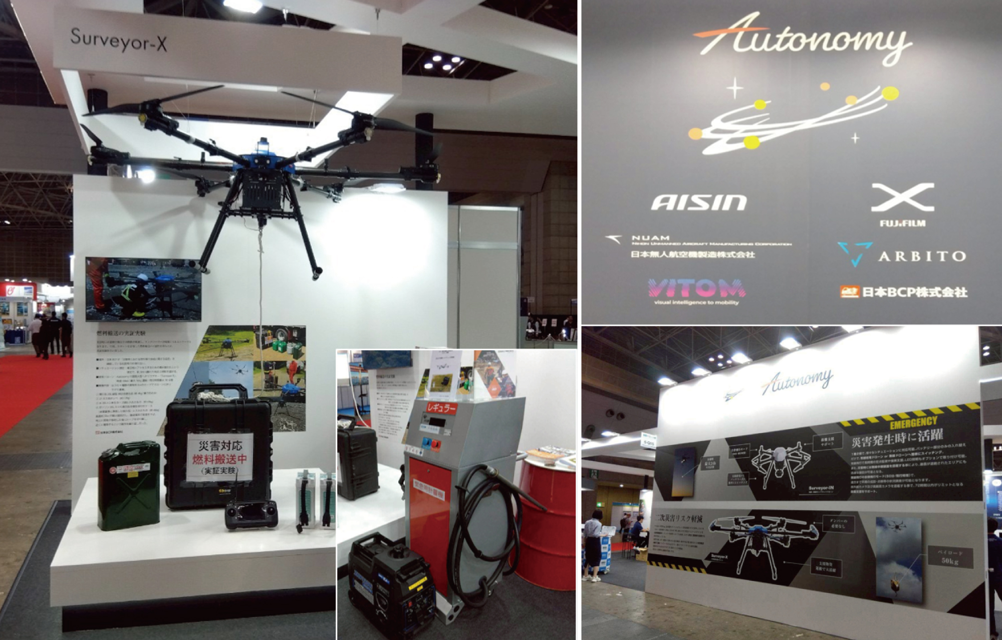 日本BCPは、株式会社Autonomy様のブースにおいて、5月21日に神奈川県松田町で実施した「災害時を想定したドローンによる燃料(ガソリン・LPガス等)の運搬実証実験」に関する展示を行いました。今回は、株式会社Autonomy様のご厚意により、大型物資運搬用ドローン「Surveyor-X」(同社製)の展示に合わせて、実証実験の成果をご案内させて頂きました。